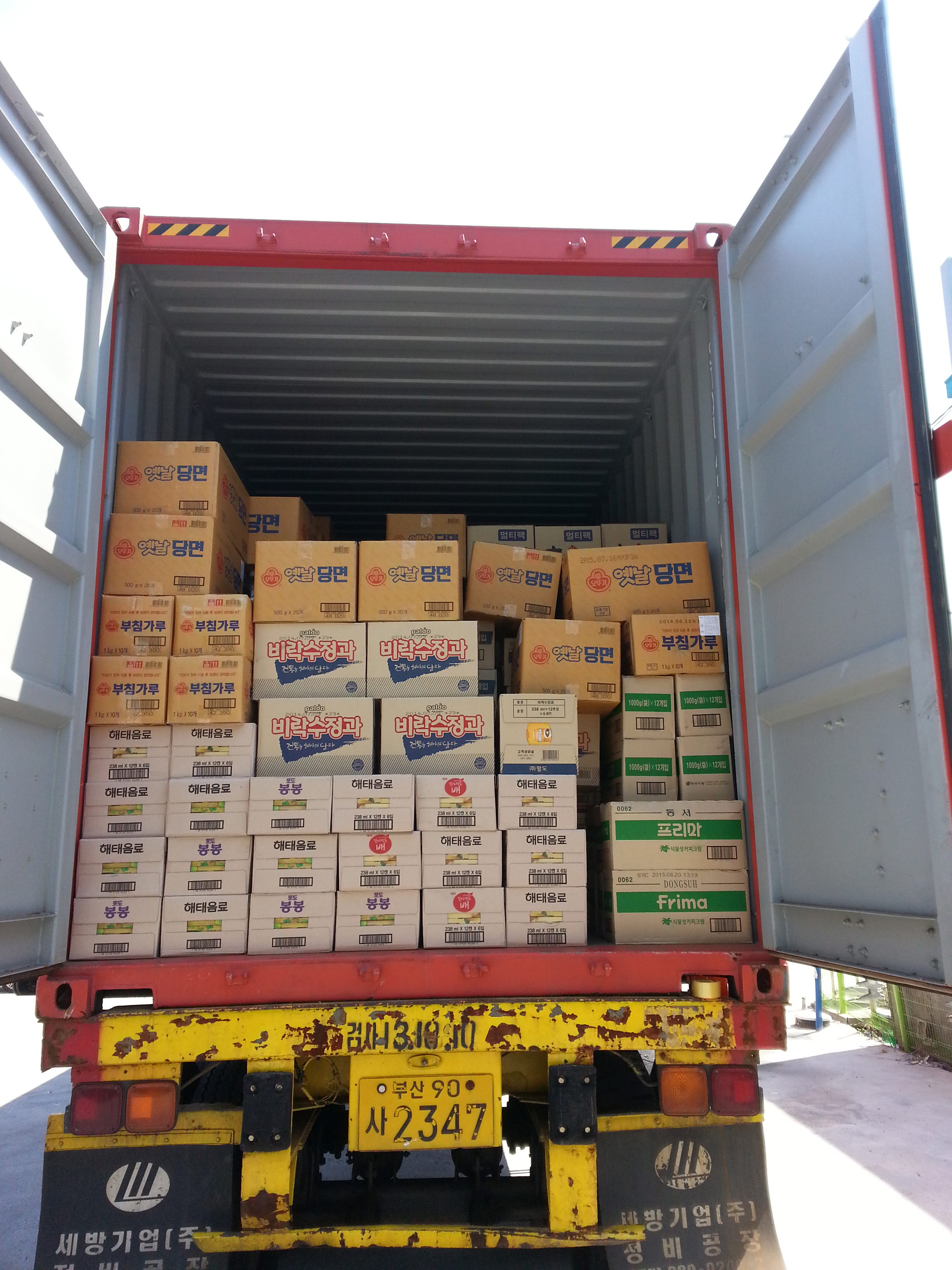 신라면,부침가루,당면,음료류,다시다 등 10여종 물품 선적완료