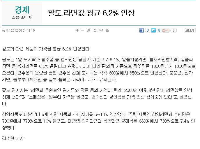 2012.08월 부터 삼양라면,팔도라면 가격인상이 되었습니다.